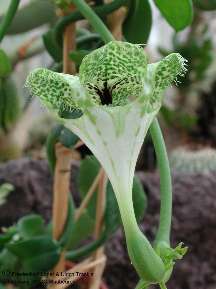 Parachute plant, Ceropegia sandersonii , has a hood over the corolla tube, which is only some nifty, but it looked like there were a group of anthers on the middle interior of the hood, which means the stamens must be connate or epipetalous. I can't find a good reference right now, though; Wikipedia's article on Ceropegia only mentions the fused corolla and downward-pointing hairs to trap flies.