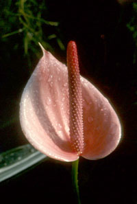 Anthurium 'Fuch's Ruffle' had a huge beautiful leaf with several spadices shorter than the leaf and spathes a little shorter than that.